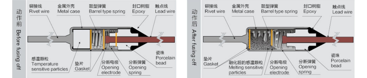 Există electrod de deschidere, arc, particule sensibile în carcasa metalică a siguranței termice RY. Arcul de tip butoi este comprimat pentru a fi instalat în carcasă, poate intra în contact cu firul de plumb cu ajutorul garniturii, În condiții normale, electricitatea curge prin firul de plumb, electrodul de deschidere, carcasa metalică și firul de nit.